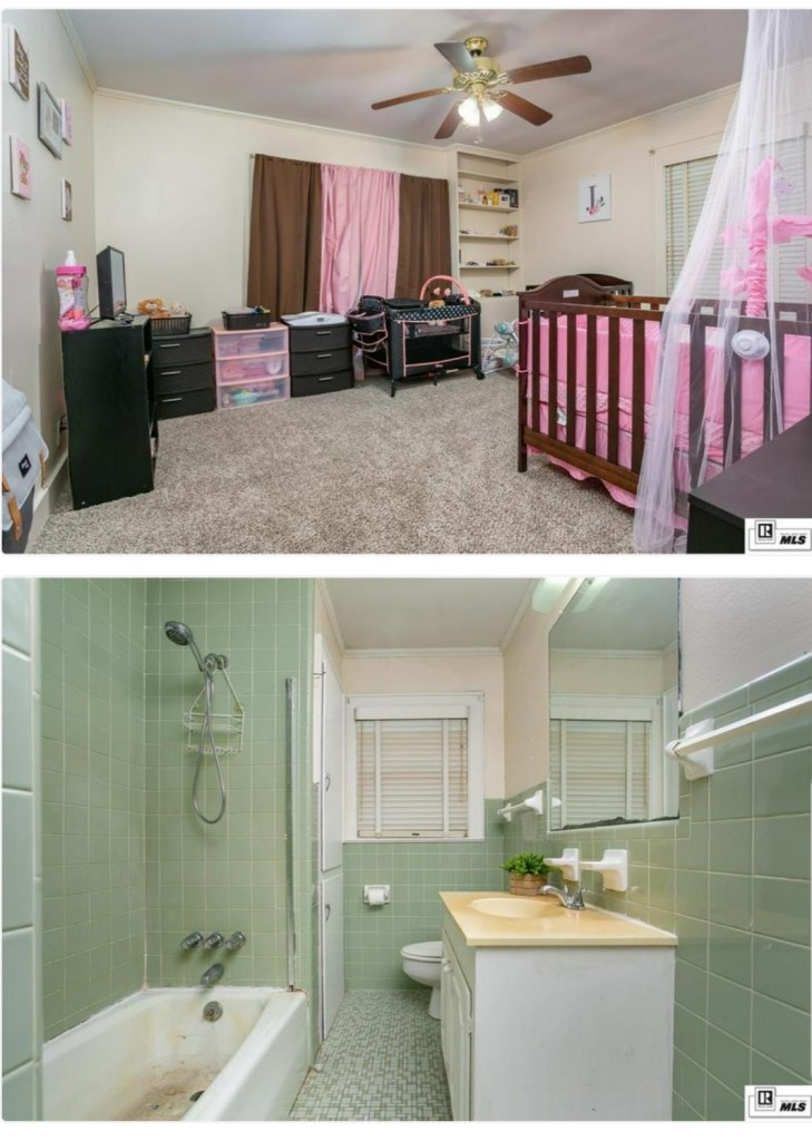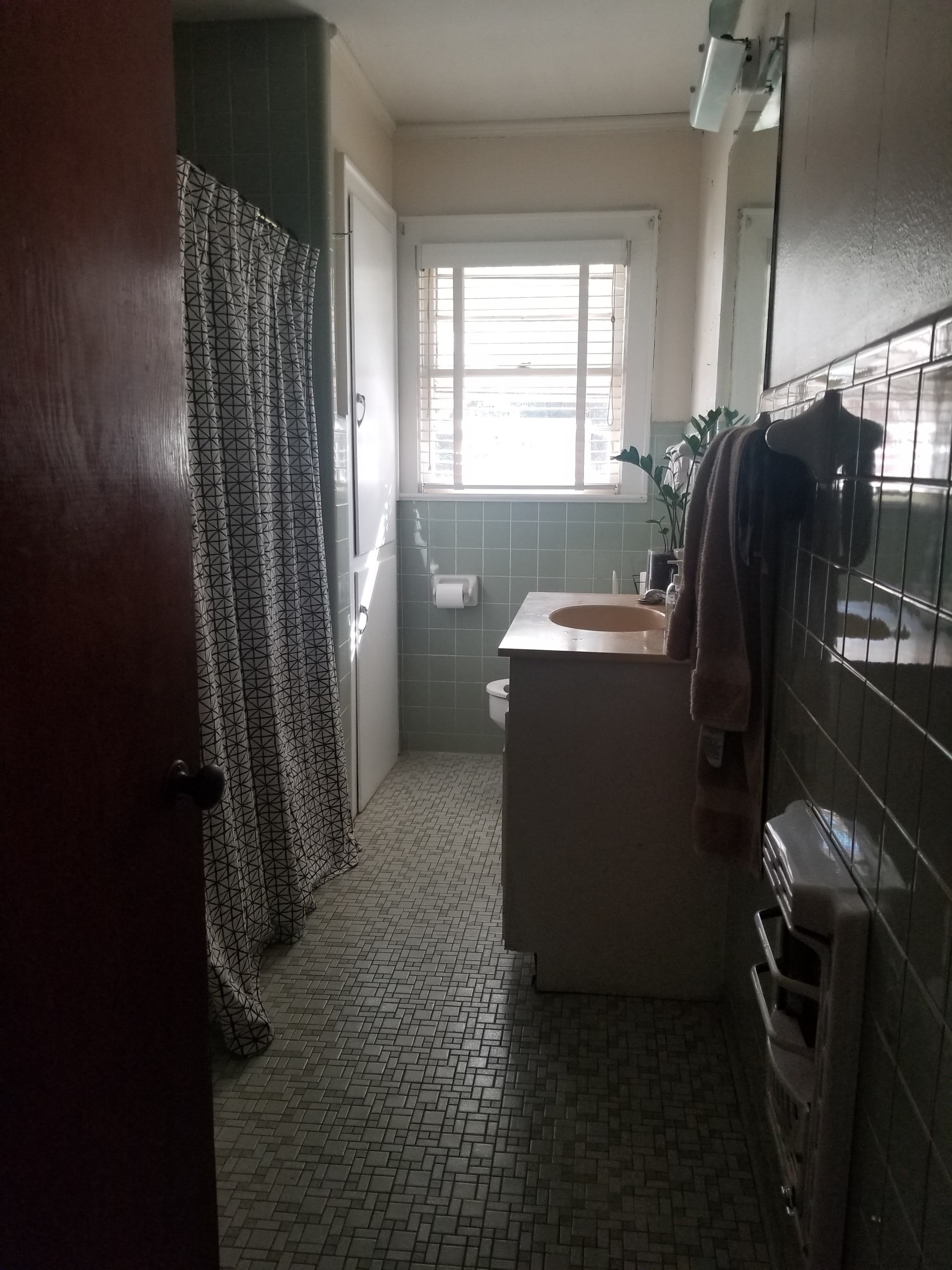 Our house was built in the 1950s and has minimal updates. We have a pink bathroom (above) and a green bathroom (below).